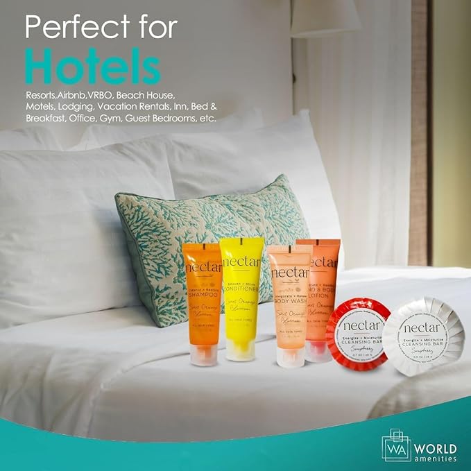 Nectar Mini Travel Size Toiletries Bathroom Kit | Sweet Orange Blossom| Shampoo, Conditioner, Body Wash, Lotion, Two Round Cleansing Bars and Body Bar