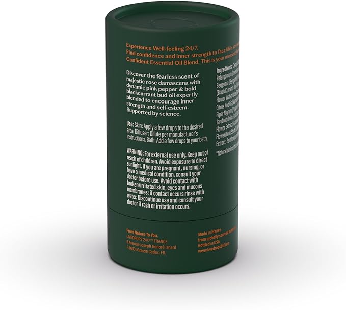 LIVEDROPS 24/7 Confident Essential Oil Blend - Crafted in France - Rose Damascena, Pink Pepper & Blackcurrant Bud Oil. Pure & Natural - Apply Directly on Skin or in Diffuser - Clinically Tested