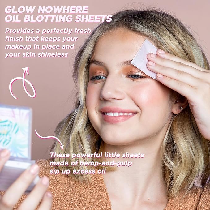 - GLOW NOWHERE OIL BLOTTING SHEETS - Our biodegradable sheets are your secret weapon against unwanted oil shine. They effortlessly absorb excess oil without leaving residue, ensuring your makeup stays in place and your skin looks radiant all day long.