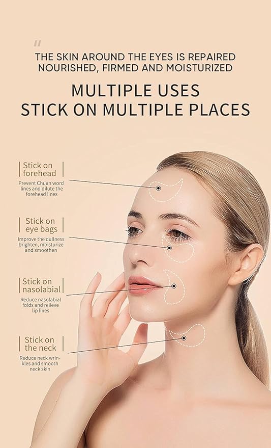 - ๐ Extra Usage Tip: You can also apply the Hydrogel Patches at the neck, around the mouth & forehead as an anti-wrinkle and dryness solution since they will adhere to any part you apply them to allow the skin to absorb all the ingredients targeting the wish area and obtaining the same benefits listed above.