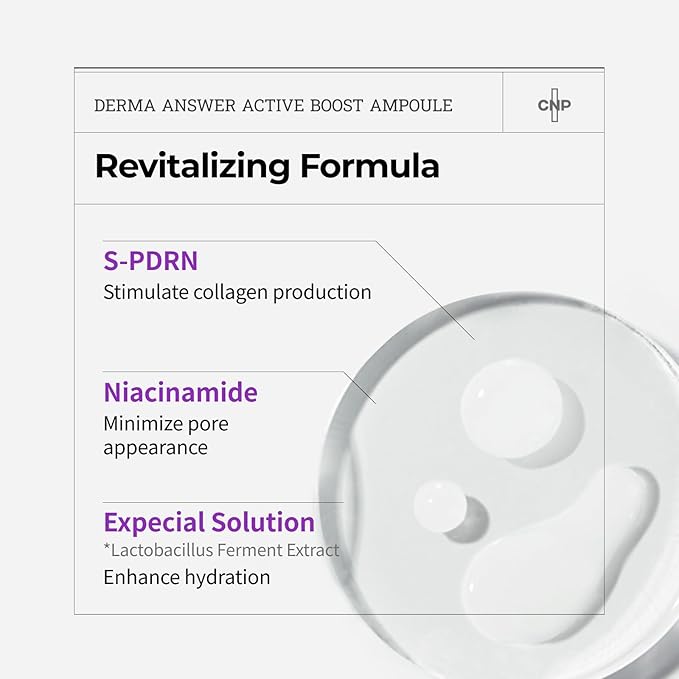 - CNP DERMA ANSWER ACTIVE BOOST AMPULE (30ml/1.01fl oz) - CNP Derma Answer Active Boost Ampule rejuvenates skin by targeting aging signs, enhancing elasticity, and diminishing the appearance of fine lines, revealing a youthful appearance in just 4 weeks.