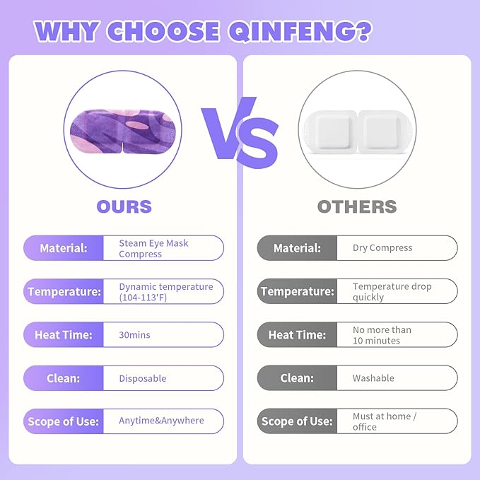 - ✨👁️【104~113℉ Hot Compress for Eyes】Our hot eye patch adopts steam heating and temperature control technology- up to 104~113℉.This self warming heated eye mask will release fine moist steam, comfort the skin around eyes, let tired eye enjoy the steam, it kept working with comfortable steam for your eyes.