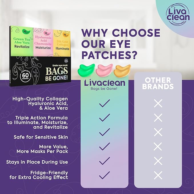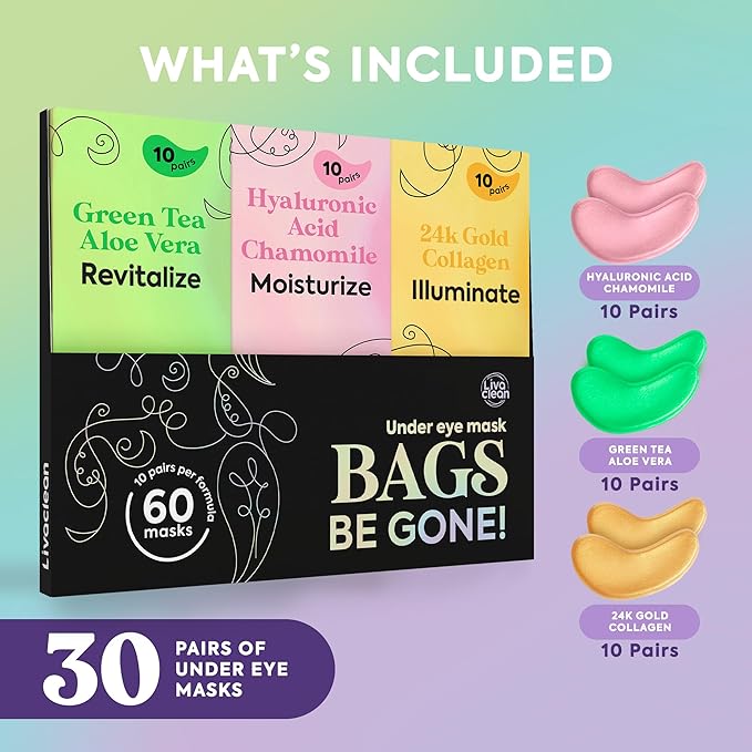 LivaClean 24k Gold Under Eye Patches (30 Pairs), Eye Mask, Collagen Skin Care Products, Eye Patches for Puffy Eyes, Eye Masks for Dark Circles and Puffiness