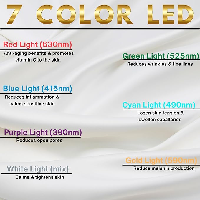- (7-IN-1 FACIAL TOOL) This 7-in-1 face device has 7 different LED light modes that have numerous skin care functions, which can provide a total of 7 individual benefits for skin.