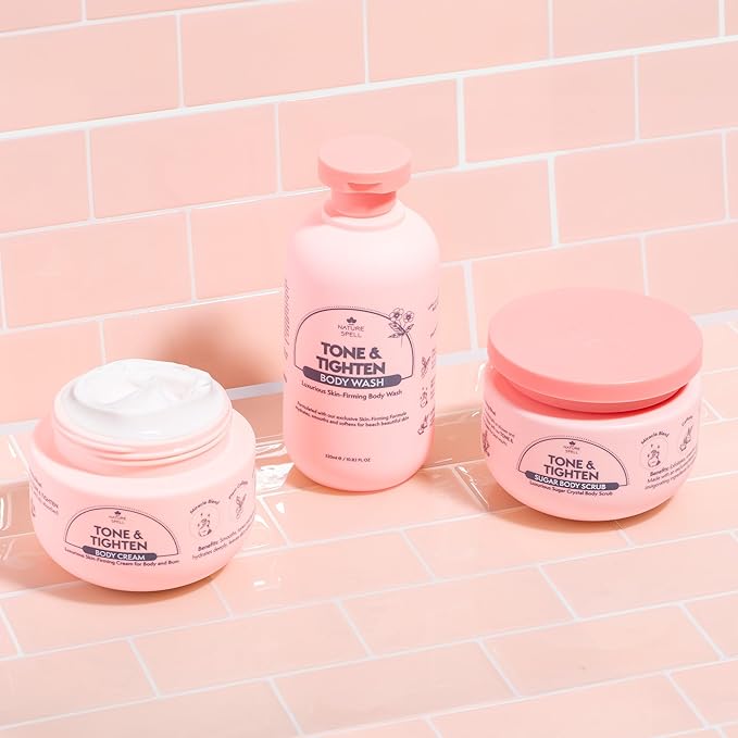 - Lather your body with our TONE & TIGHTEN Body Wash before rinsing with water. Follow with our TONE & TIGHTEN Body Scrub. Use your hand or a mitt to gently buff your skin then rinse. Our TONE & TIGHTEN Body Cream can be massaged all over the skin until fully absorbed.