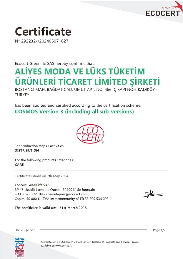 - Certified by Ecocert Cosmos Natural – 100% natural content & mainly organic ingredients