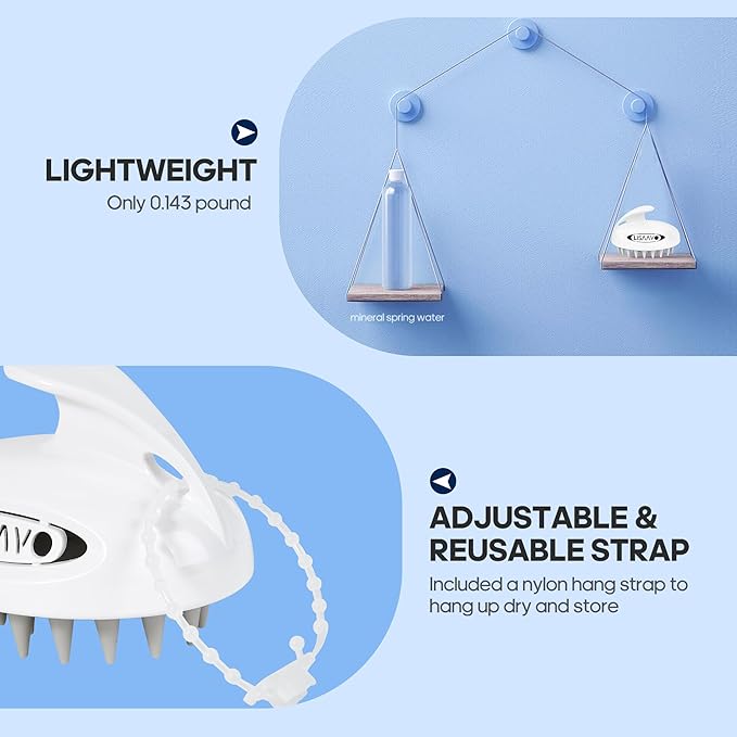 - Our scalp brush massager is only 0.143 pound for portable convenience and carry on the go. We also include an adjustable and reusable hang strap to hang up the hair growth scalp massager dry and store in a breeze. All Pass in Prop 65.