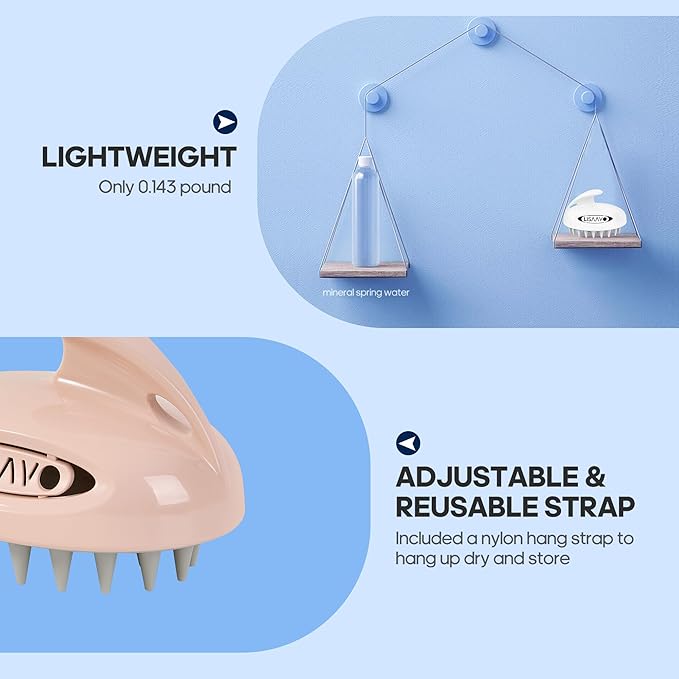 - Our scalp brush massager is only 0.143 pound for portable convenience and carry on the go. We also include an adjustable and reusable hang strap to hang up the hair growth scalp massager dry and store in a breeze. All Pass in Prop 65.