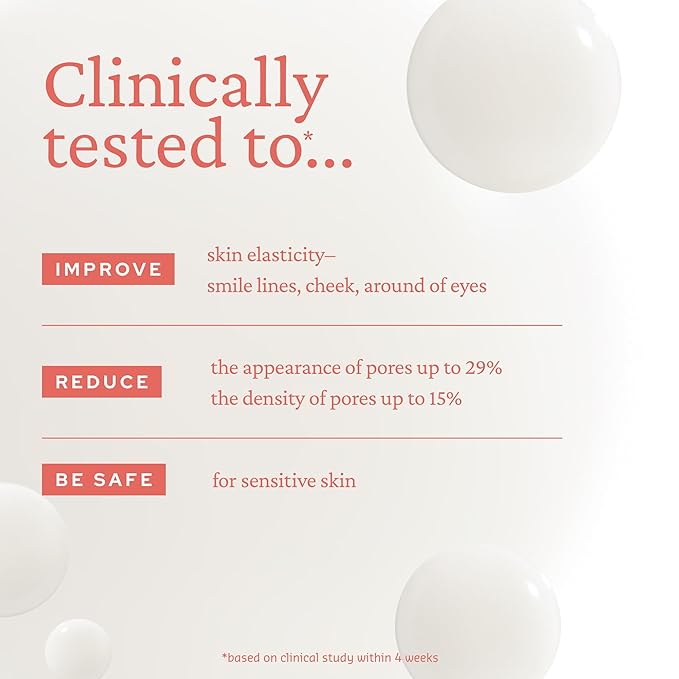 - Product Benefits : CLINICALLY TESTED TO: ● Improve skin elasticity within four weeks (including the nasolabial folds, cheeks, and the area around the eyes) ● Improve the appearance of pores up to 29% within four weeks ● Reduces the density of pores up to 15% within four weeks CLINICALLY TESTED TO: ● Improve skin elasticity within four weeks (including the nasolabial folds, cheeks, and the area around the eyes) ● Improve the appearance of pores up to 29% within four weeks ● Reduces t… See more