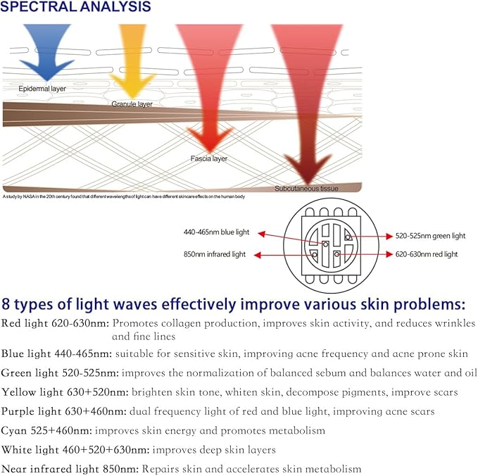 - 7 Customizable Light Modes for Targeted Care - Switch between 7 specialized LED colors + NiR Infrared Light: Red for skin revitalization | Blue for blemish management | Yellow for even tone | Green for calming | Purple for refined pores | Cyan for hydration | White for daily glow boost (Note: Results vary by individual).
