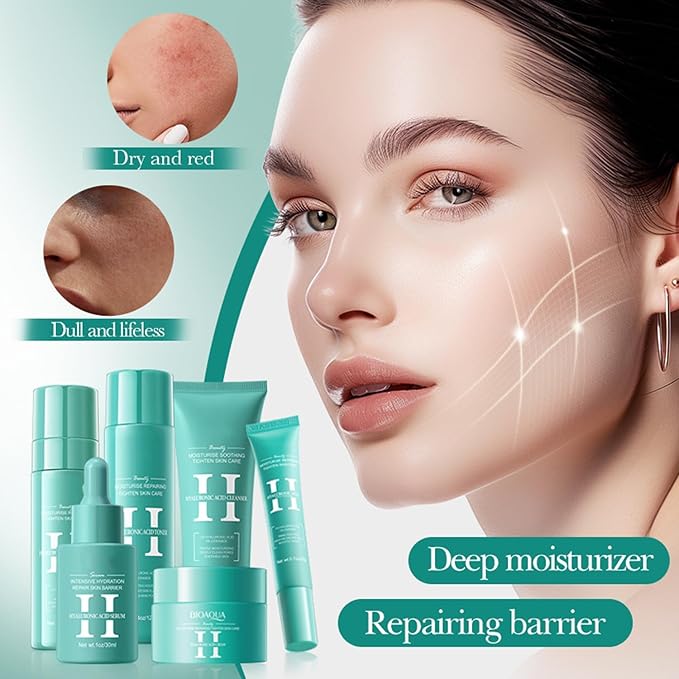 - Hyaluronic Acid Hydrated For Face: With the growth of age, the skin loses vitality, becomes dull, dry and lacks water. Skin care set contains a variety of plant essences, which can effectively improve damaged skin, solve wrinkles, spots and acne marks, prevent pigmentation, shrink pores, and make skin lasting moist