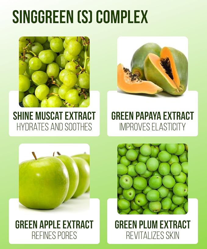 - Innovative SingGreen (S) Complex for Enhanced Skin Care - Featuring the patented SingGreen (S) complex, extracted using high-frequency methods from green fruits like Shine Muscat, Green Papaya, Green Apple, and Green Plum, this serum provides a unique blend that nourishes the skin with hydration and vitality