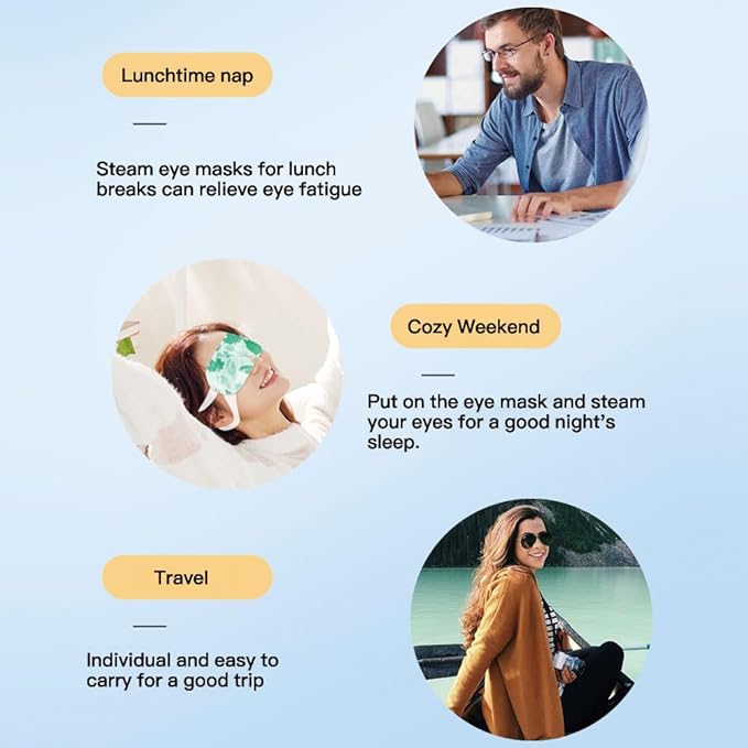 - Easy to Use & Portable: This steam eye mask with flexible elastic ear hooks.Comfortable to wear, convenient to carry and easy to use. Is suitable for any face shape and any posture, day or night, sleep or just a nap, travel, or a computer screen after a long day