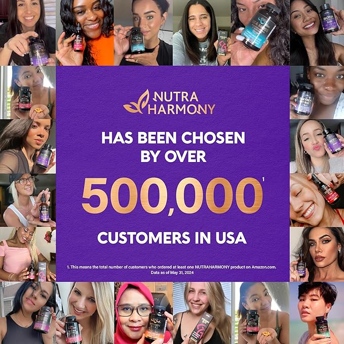 • Biotin with Hyaluronic Acid & Collagen Supplement — The Nutraharmony biotin supplement contains potent Biotin, Collagen, Keratin, and other essential nutrients that naturally support your health and beauty. Take two capsules a day with our highly bioavailable formula that promotes fast and proper absorption. Take care of your skin.