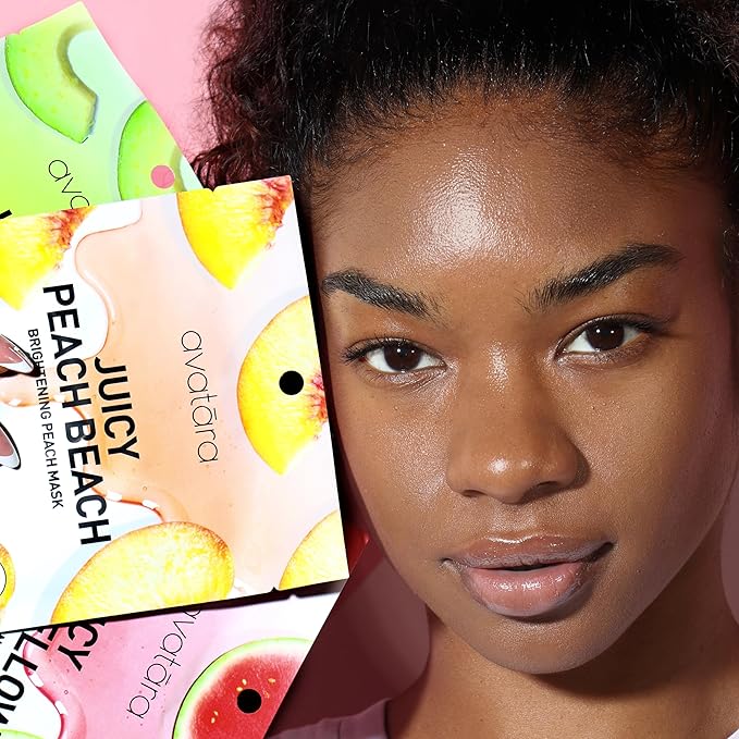 - This set contains: (2) Juicy Peach Beach Brightening Masks This cooling, natural fiber sheet mask blends together antioxidant-rich botanicals like Peach & Sunflower Seed to keep skin glowing & even in tone - 2x 0.71 fl. oz. / 21 mL