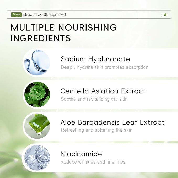 - 【Rich In Fresh Green Tea】- Skin care kit for women contains every drop of green tea essence freshly picked in the morning, extracted, and added with Centella asiatica and sodium hyaluronate ingredients, which can deeply nourish and improve your skin. The Skin care routine kit for women is lightweight, skin friendly, and suitable for all skin types