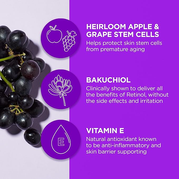 - Natural Formula: Includes fruit stem cell complex and super antioxidants to boost dermal vitality plus Bakuchiol, a natural, plant based, non irritating alternative to retinol