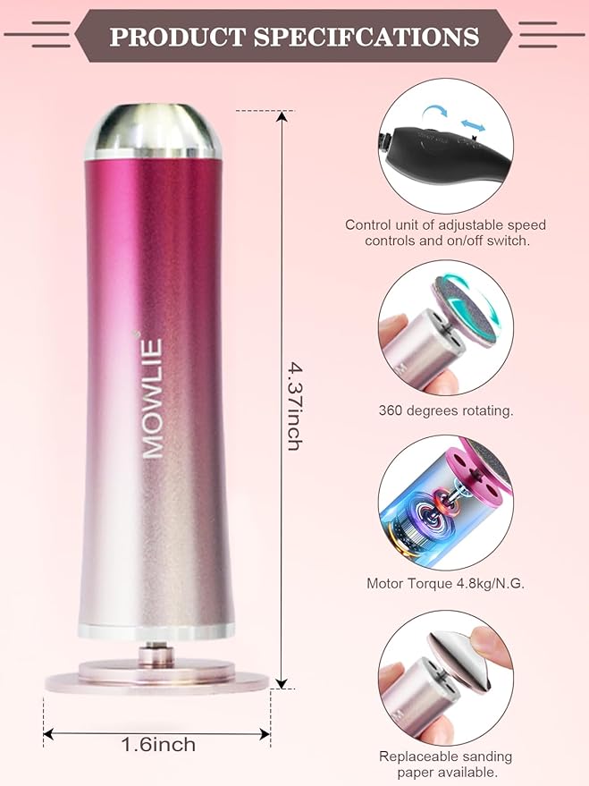 - Convenient Operation, Easy to Use: MOWLIE's electric pedicure tools for feet is designed to be simple and user-friendly. No professional skills required – easily complete your foot care at home, saving time and energy. Perfect for busy modern individuals, giving you more time to spend with family