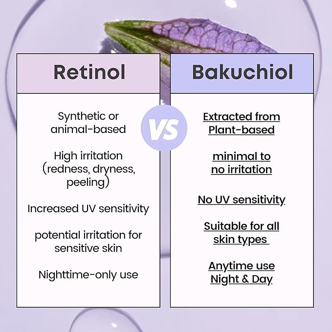 - BAKUCHIOL: GENTLE RETINOL ALTERNATIVE – Enjoy the benefits of a natural retinol alternative without irritation with Bakuchiol. It renews skin, reduces wrinkles, and enhances firmness without redness or peeling. Unlike retinol, it is not sensitive to sunlight, making it safe for both day and night use.