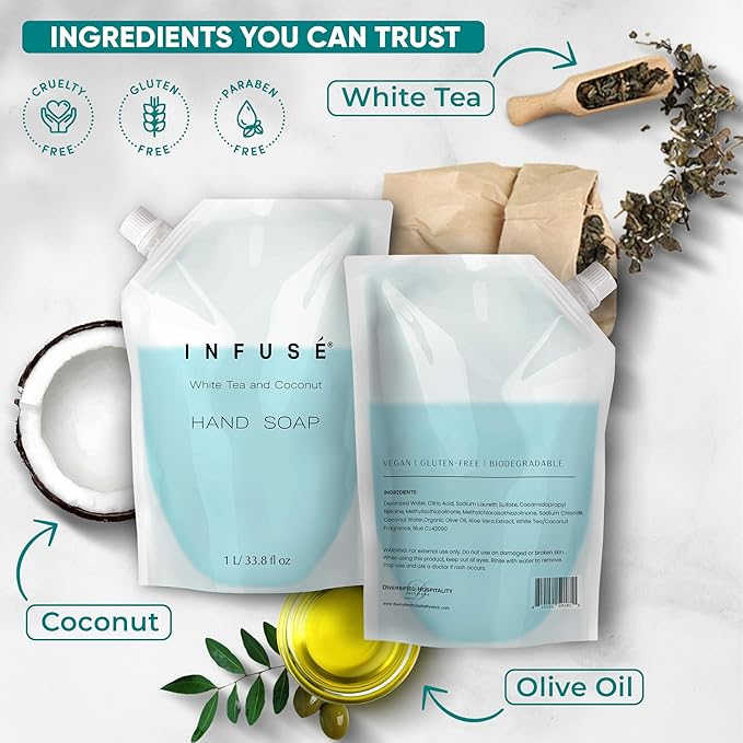 - HOTEL-QUALITY, LUXURIOUS AMENITIES: Enhance your guest experience with the Infuse White Tea and Coconut in a convenient 1-Liter Refill Bag, designed to refill wall-mounted and stand-alone dispensers. Enriched with white tea, coconut, organic aloe, and olive oil, this gentle, daily-use formula suits sensitive skin and hair. Ideal for hotels, vacation rentals, guest bathrooms, and homes, these premium amenities add sophistication and functionality to any hospitality space.