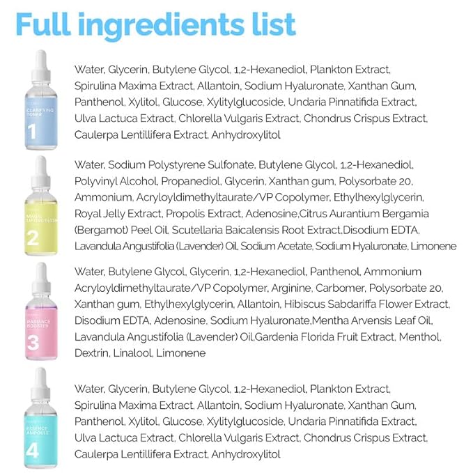 - Comprehensive Care System: Helps address the appearance of wrinkles, supports skin elasticity, and enhances hydration with essence toner, lifting mask, vitamin booster, and clarifying ampoule.