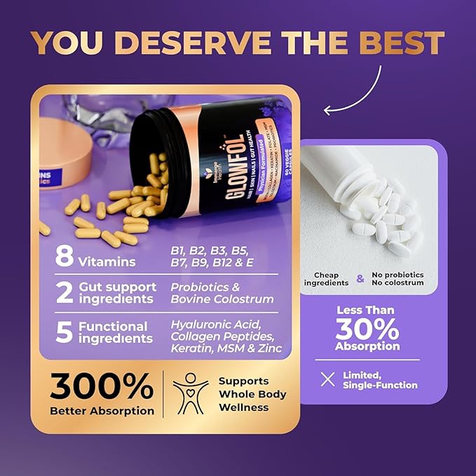 - UNIQUE PROBIOTIC GUT SUPPORT: Unlike typical hair and nail vitamins, Glowfol formula includes a 50 Billion CFU probiotic blend. This innovative addition aids nutrient absorption, enhancing the efficacy of our hair growth complex and supporting overall wellness.