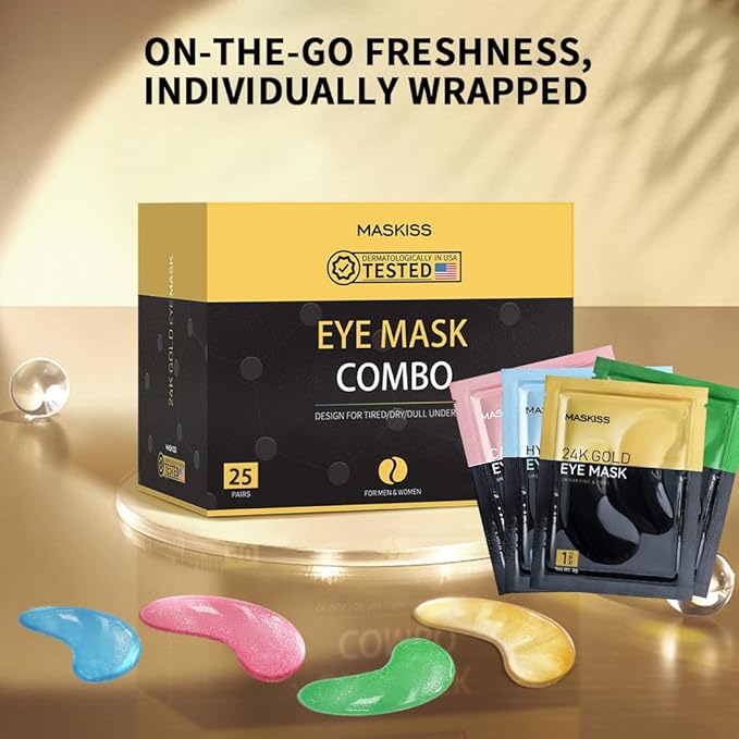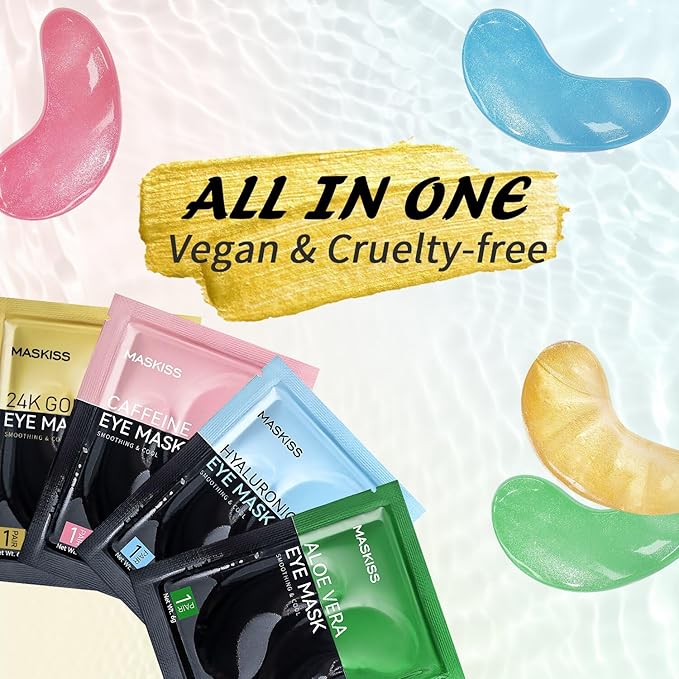 - Comprehensive Eye Care Treatment: The Maskiss set includes 4 colors, 25airs of under-eye patches. 24k Gold eye mask helps to smooth the skin, reduce fine lines and wrinkles. Caffeine eye patches help promotes eye metabolism and circulation, and reduces eye bags and puffy eyes. Hyaluronic acid eye masks help to fade dry lines and wrinkles, and locks in moisture and nutrition. Aloe vera eye patch helps to reduce pigmentation, repair the healing barrier, and gently moisturize the skin. Add these to your daily self-care routine for a visibly younger, well-rested appearance.