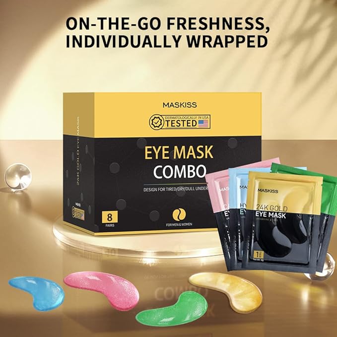 - Comprehensive Eye Care Treatment: The Maskiss set includes 4 colors, 8 pairs of under-eye patches. 24k Gold eye mask helps to smooth the skin, reduce fine lines and wrinkles. Caffeine eye patches help promotes eye metabolism and circulation, and reduces eye bags and puffy eyes. Hyaluronic acid eye masks help to fade dry lines and wrinkles, and locks in moisture and nutrition. Aloe vera eye patch helps to reduce pigmentation, repair the healing barrier, and gently moisturize the skin. Add these to your daily self-care routine for a visibly younger, well-rested appearance.