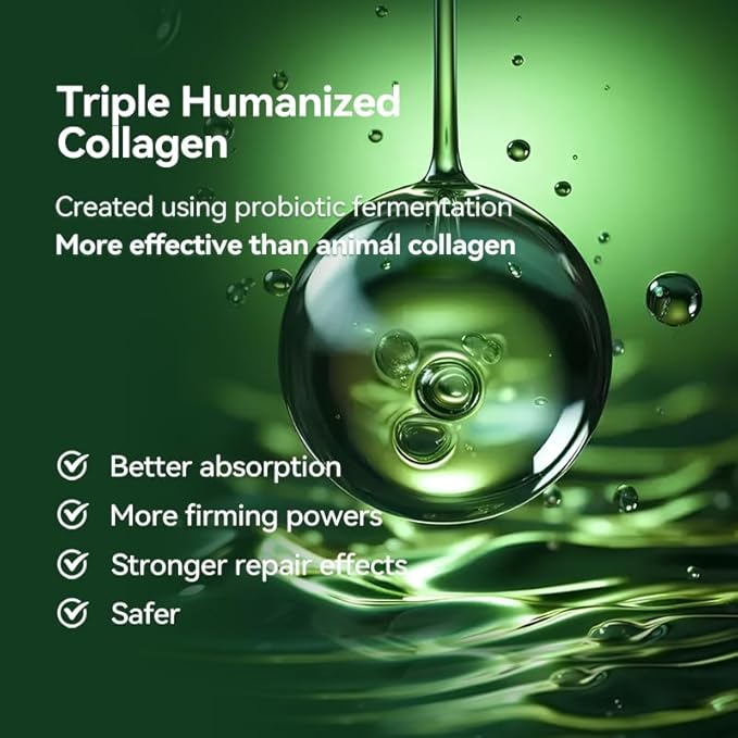 - Advanced Collagen Formula:Powered by humanoid recombinant collagen, its small-molecule structure ensures deep absorption, improving skin elasticity and strengthening the skin barrier for youthful resilience