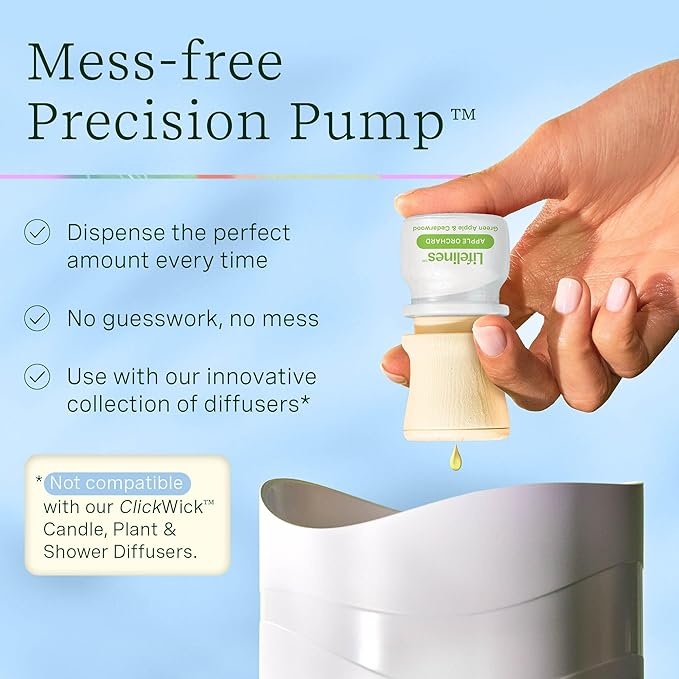 - Mess-Free Precision Pump: Dispense the perfect amount every time with no guesswork and no mess. NOT compatible with our ClickWick Candle, Plant, or Shower diffusers, which require ClickWick Essential Oil Blends.