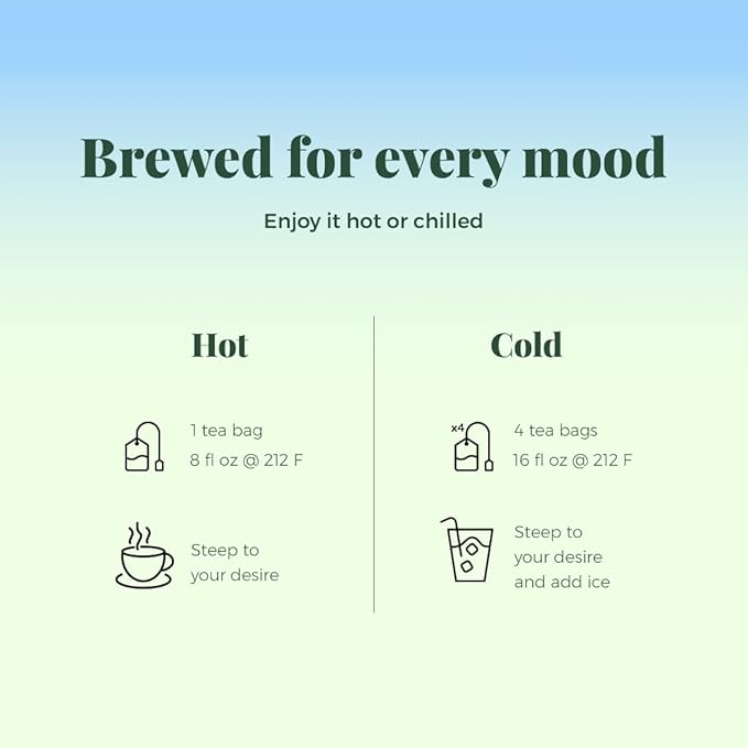 - Hot or Iced—Your Way: Enjoy hot by steeping a green tea bag in 8 oz of water at 175°F for 2–3 minutes, or refresh with iced tea by steeping, cooling, and pouring over ice. A versatile addition to your healthy lifestyle!