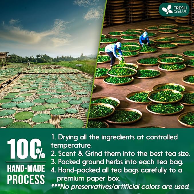 - ☘️ HAND-MADE PRODUCING PROCESSES, NO ADDITIVES: Our Lotus Green tea is processed in a hygienic environment. The tea bags are individually wrapped for freshness and convenience, maintain the herb's freshness and aroma, ensure the safety of customers and quality of products. Sugar-Free, Gluten Free, Vegan, No Artificial Flavors, No Colors Added.