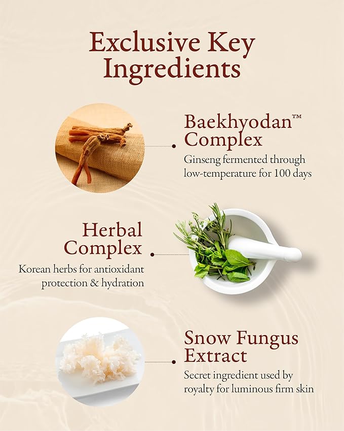 - KEY INGREDIENTS – The formula features Baekhyodan, a proprietary herbal blend fermented in traditional earthenware using wild ginseng from Jirisan Mountain and mulberry-derived Lactobacillus. This advanced herbal concentrate boosts skin vitality and moisture retention. Silver Mushroom extract, known for its powerful hydration capabilities, works to soften and smooth rough, dry skin while restoring natural glow and elasticity.