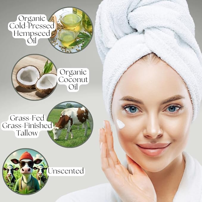 - ✅ Deep Hydration & Skin Repair – Grass-fed tallow mimics natural skin oils, delivering lasting moisture and nourishment. ✅ Nourishing Hempseed Oil – Packed with omega fatty acids to soothe inflammation and promote healthy skin. ✅ Organic Coconut Oil – Locks in moisture, softens skin, and provides natural antibacterial benefits. ✅ Gentle & Unscented – Free from essential oils and fragrances, making it ideal for sensitive skin. ✅ Pure & Handmade – No parabens, fillers, or synthetic additives—just simple, natural ingredients.