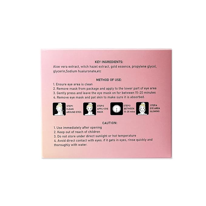 - * 24K Gold Under Eye Mask – Gel Pads for Dark Circles & Puffiness. * Brightens & Reduces Dark Circles – 24K gold helps boost circulation, diminishing under-eye discoloration. * Depuffs & Soothes – Cooling gel formula reduces puffiness and refreshes tired eyes. * Hydrating & Anti-Aging – Infused with hyaluronic acid and collagen to deeply moisturize and smooth fine lines.