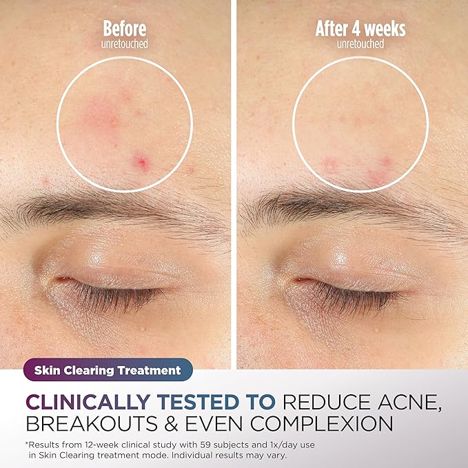 • Skin Clearing Treatment: Experience chemical-free acne-clearing with an 8-minute Blue & Infrared and Red LED session to reduce acne & redness for a more even and clear complexion**. **Results from 12-week clinical study with 59 subjects and 1x/day use in Skin Clearing treatment mode. Individual results may vary