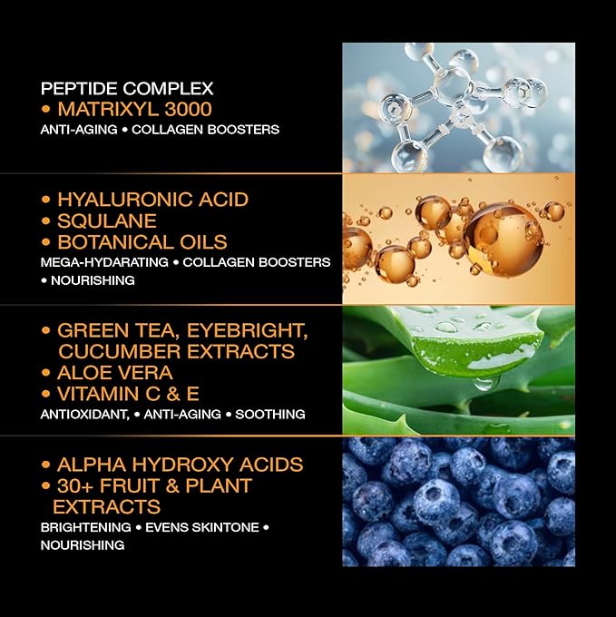 - Matrixyl 3000 (Palmitoyl Tetrapeptide-7 & Palmitoyl Tripeptide-1) & Acetyl Hexapeptide-1 synergistically stimulate collagen production, helping to reduce the appearance of fine lines and wrinkles.