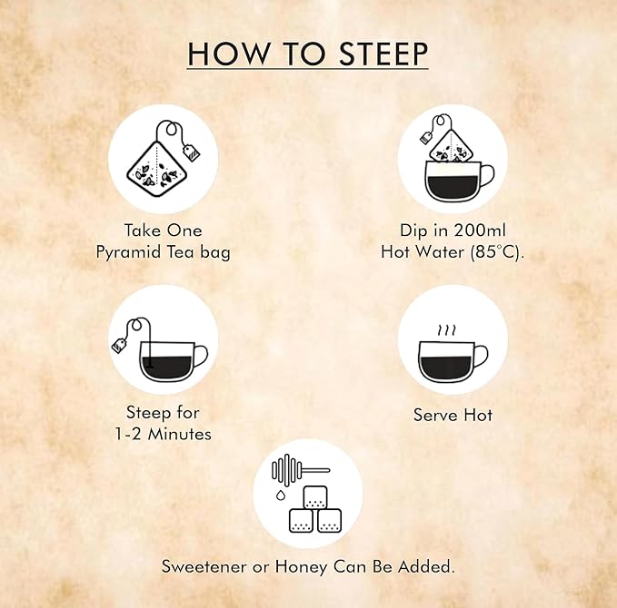 - 20 Enveloped Pyramid Tea Bags for Convenience & Freshness – Each pyramid-shaped tea bag is individually sealed in a foil envelope, ensuring hygiene, preserving aroma, and offering ease of use whether at home, in the office, or on the go.