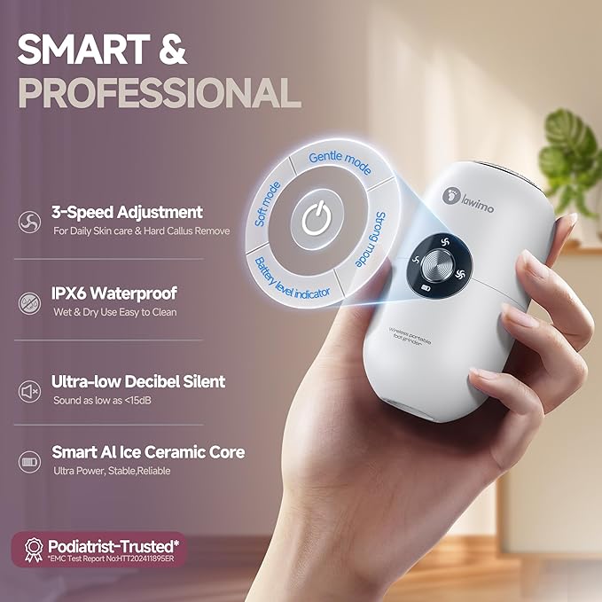 - 【3-Speed Grinding System】 Our electric foot callus remover features an industry-first 3-speed system (1200/1400/1650 RPM) for 3x faster callus removal. The 1650 RPM mode erases 3mm-thick calluses in 10 seconds—ideal for electric foot file users seeking salon-level results during a quick bath.