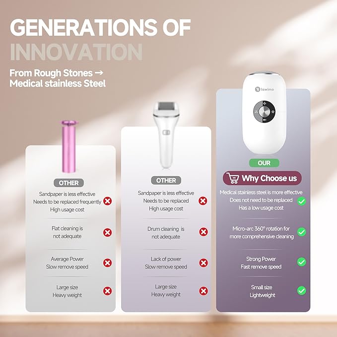 - 【Durable 316F Stainless Steel Heads】 Upgrade from manual foot sanders for feet! This electric callus remover uses lifetime 316F steel heads (no replacements needed) to save $60/year and prevent bacterial growth—perfect for hygienic electric foot filer routines.