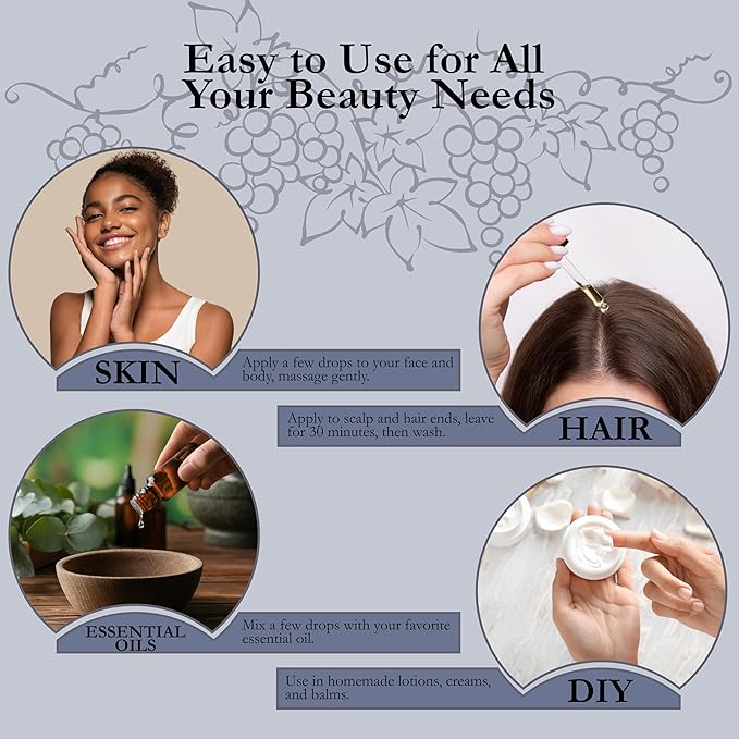 - ✅ MULTI-USE - From the kitchen to your self-care routine, our premium grape seed oil shines. Elevate your culinary creations, nourish your skin, and transform your hair with this versatile elixir. One product, multiple benefits – simplify your life with grape seed goodness!