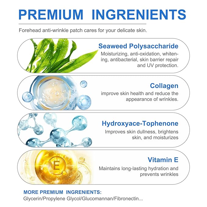 - [PREMIUM INGREDIENTS]:These forehead wrinkle patches are made of high-quality ingredients. This gentle yet effective treatment is infused with collagen, Glycerin, Seaweed Polysaccharide, and vitamin E. This is providing deep hydration, forehead wrinkle remover and skin regeneration.