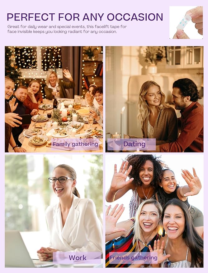 - PERFECT FOR ANY OCCASION: Great for daily wear and special events, this facelift tape for face invisible keeps you looking radiant for any occasion. Whether it's a wedding, party, travel, or live streaming, this anti-wrinkle face tape is your go-to beauty secret.